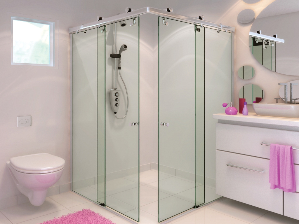 O sistema de roldanas aparentes propicia um visual incrível ao banheiro, que pode ser instalado com vários tipos de vidros temperados com 8mm de espessura, com vidros incolores, vidros coloridos ou vidros jateado. O Box Encanto está disponível em duas versões: Vidro Padrão e Vidro Engenharia.